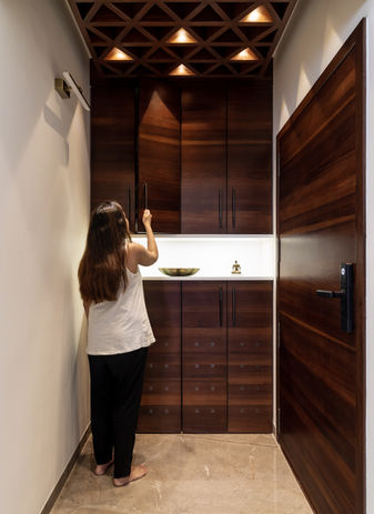 A highlight of the home is the expansive balcony with lush green views. The angled backdrop, initially met with hesitation, now serves as a favorite gathering spot for the family to enjoy evening chai and the breathtaking scenery. The daughter's desire for a photogenic backdrop was fulfilled with the addition of an artificial plant wall. This Maison De Luxe is a testament to successful multi-generational living, where each member finds comfort and joy within its elegant and functional spaces.